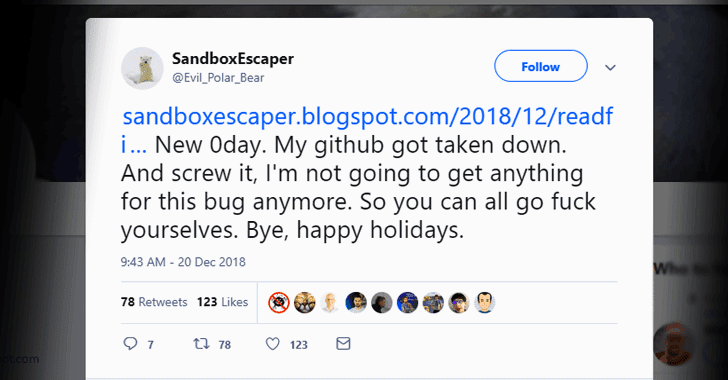 SandboxEscaper는 이전에 두개의 제로데이 취약점을 공개 했던 같은 사람으로, 그는 마이크로 소프트웨어가 취약점을 패치 할때까지 모든 위도우 사용자가 해커에게 취약하도록 놔뒀다.