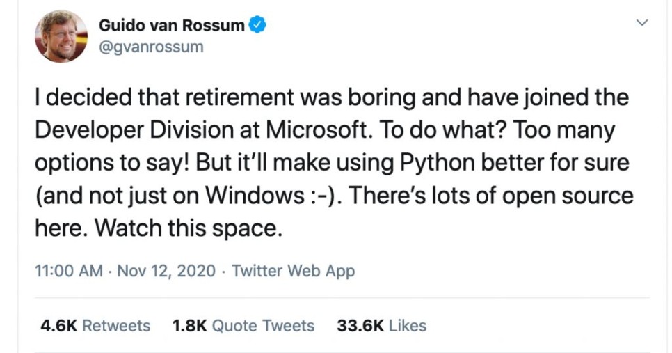 반 로섬은 마이크로소프트 개발 부서에 합류했다고 밝히면서 ‘은퇴가 지루하다’고 전했다. 반 로섬은 “무엇을 할 것인지 선택지가 너무 많다. 하지만 확실하게 말할 수 있는 것은 파이썬을 더 잘 사용할 수 있게 해줄 것이다(윈도우뿐만 아니라). 여기에는 많은 오픈소스가 있다. 이 곳을 주목하라”라고 말했다.