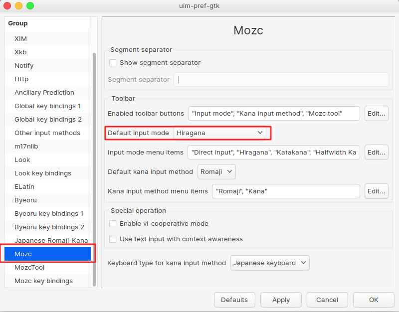밑에 Mozc 로 가서 Default input mode 가 Direct input 으로 되있을텐데 이부분을 Hiragana로 바꿔줍니다.